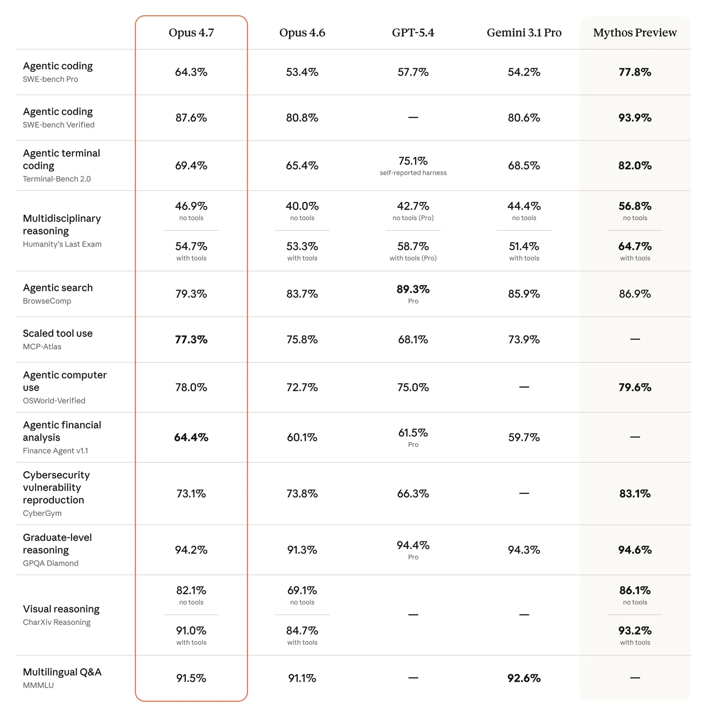 基准测试表现在智能体编码、计算机操作等多项应用场景的基准测试中,Opus 4.7 表现亮眼,性能超越了 Opus 4.6、GPT-5.4 以及 Gemini 3.1 Pro,但略逊于能力更全面的 Claude Mythos Preview。不过 Mythos 并未像 Opus 4.7 这样全面开放使用,目前 Anthropic 仅向苹果等核心软件平台厂商提供该版本。